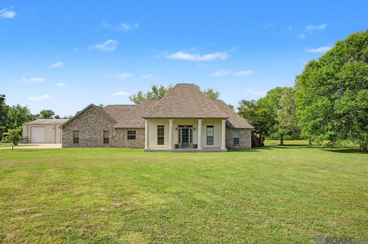 Custom built 4-bedroom, 3-bath home with a dedicated office, situated on 6.86 acres in Flood Zone X and never flooded. Built 18 inches above the flood plain with a post-tension slab, this home reflects quality construction and thoughtful attention to detail throughout. The open-concept layout features a spacious family room filled with natural light from a wall of windows overlooking the expansive backyard. The living area flows seamlessly into the dining space and chef's kitchen, complete with a gas range, warming shelves above the stove, large island, granite countertops, abundant cabinetry, and a corner pantry. The triple split floor plan offers both functionality and privacy. Two bedrooms share a bath, while another bedroom is positioned on its own wing with direct access to a separate bathroom?ideal for guests or multi-generational living. All bedrooms are generously sized. The primary suite offers private access to the patio and includes an en suite bath with dual vanities, a large walk-in closet, soaking tub, and separate shower. Throughout the home, you'll find no carpet, enhancing both style and ease of maintenance. The office provides flexibility as a formal dining room, playroom, or additional living space. Outdoor features include a large patio?partially covered?perfect for entertaining or relaxing while enjoying the surrounding acreage. The property also includes a garage, additional garage storage, and a substantial 50' x 75' workshop. The workshop is equipped with a half bathroom and a professionally vented room currently used for painting cars, making it ideal for hobbyists or business use. With acreage, quality construction, and versatile living space, this property offers a rare opportunity for those seeking room to spread out with modern comforts.