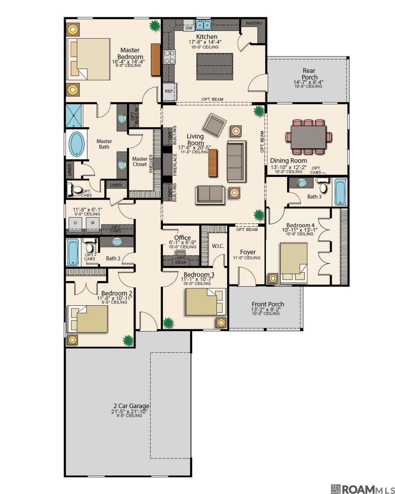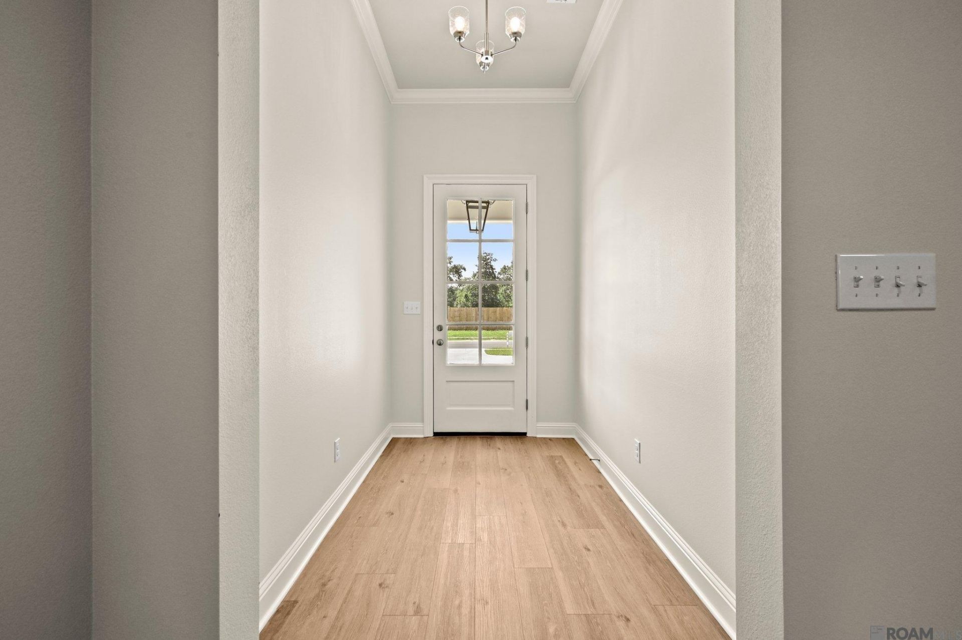 Broussard B plan by Level Homes underway in Delaune Estates! The Broussard plan is a one-story home featuring four beds, three full baths and an office with an open and spacious layout and just over 2300 sq feet! Enter this home from the very inviting front porch into the foyer which leads you into the spacious living room, kitchen, and separate dining. The living room is centered around a vent-less gas fireplace with a quartz surround and has the 'option to add custom built-in bookshelves on both sides of the fireplace. The gourmet kitchen is separated by an exposed beam and features custom cabinetry with under cabinet lighting & 5 hardware pulls, large center island with pendant lighting, 3 cm Carrara Blanco quartz, 3x6 herringbone subway tile backsplash, single basin granite composite sink, stainless steel appliances including a 36'' gas cooktop with custom gold pot filler, a single wall oven and built in microwave, gold faucet and a walk-in corner pantry. The formal dining is set off the living room and overlooks the rear porch and backyard. The primary suite is tucked away at the rear of the home with a spa like bath including dual vanities, framed mirrors, separate tub and custom job-built shower and a HUGE walk-in closet. Beds 2 and 3 are located off the garage entry and share a full bath which is located across from the office! The spacious walk-in laundry room with a storage closet is located off the hall with beds 2 and 3. Bed four is on the opposite side of the home with a full bath located in the hallway. The yard will be professionally landscaped & fully sodded! Est completion of Aug 2026, buyers can pick/approve certain colors & options for a certain period of time. Delaune Estates is one of Ascension's newest communities, built by Level Homes and located off of HWY 73 and I-10! This development features multiple ponds, waterfront lots and a community pool with pavilion! *Pictures are not of the actual home but are of the same floorplan.