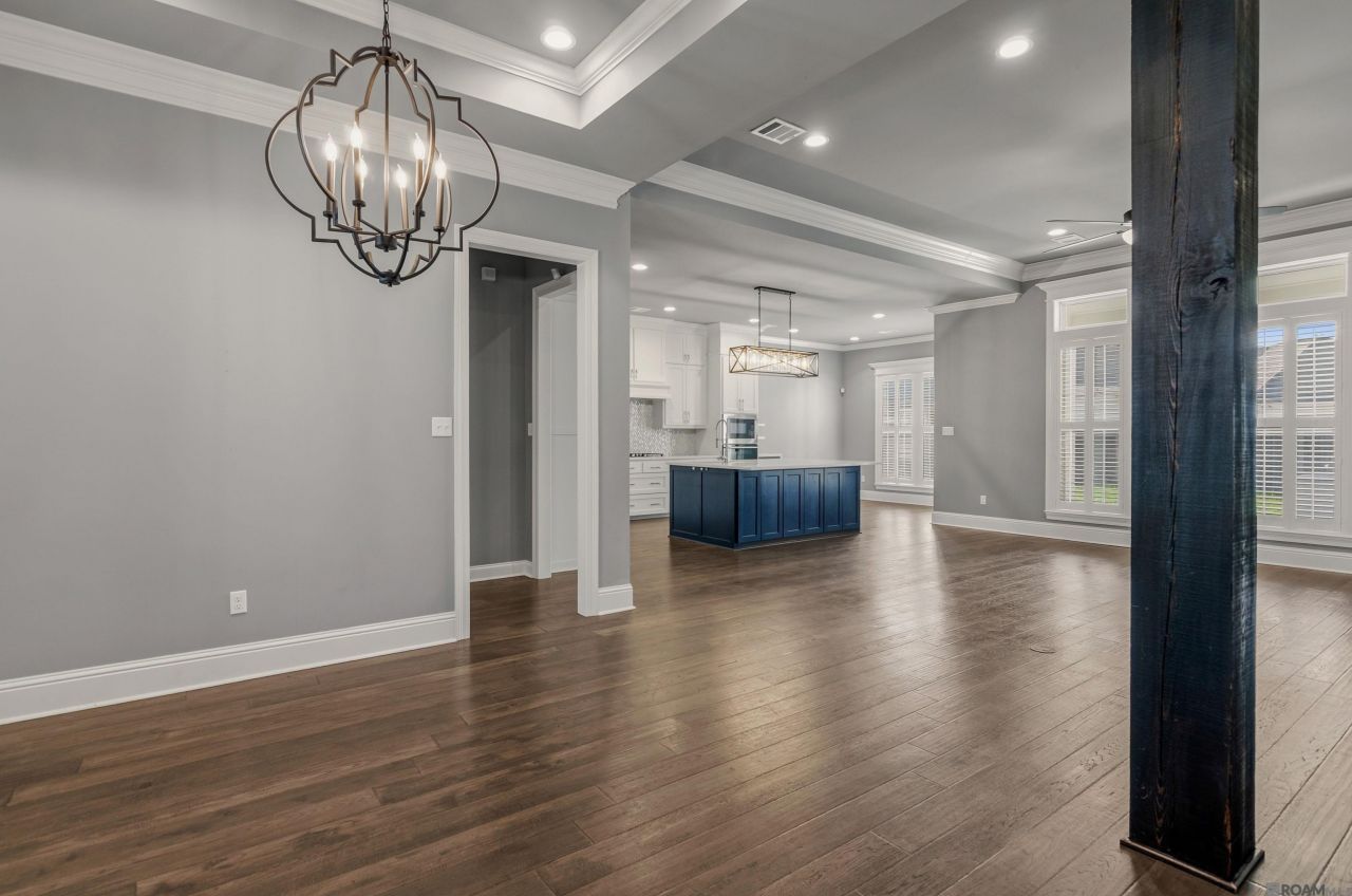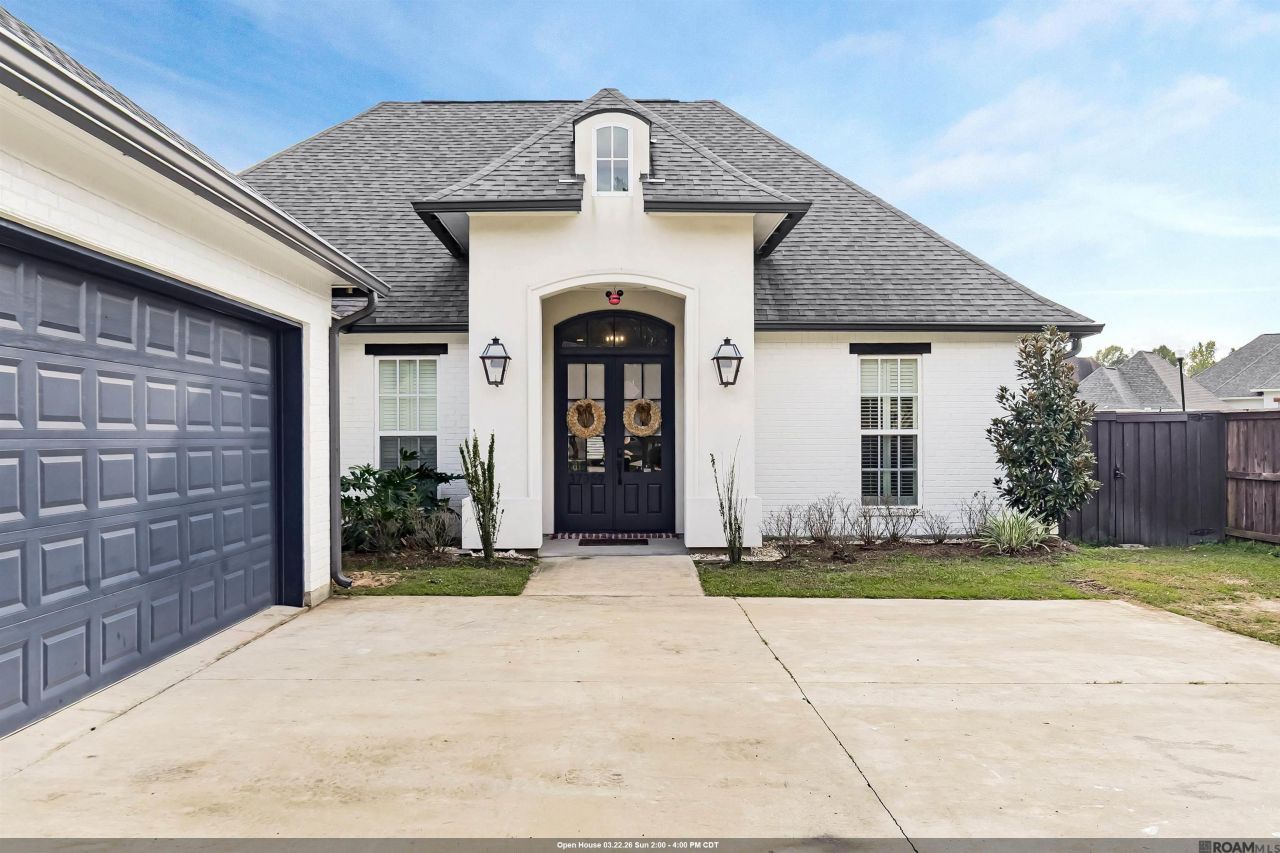 Located in the desirable Hollows at Dutchtown, this 4-bedroom, 3-bath custom home offers a well-designed layout with quality finishes throughout. Built just 5 years ago, the home features an open-concept living area with 11-foot ceilings, cypress beam accents, wood flooring, plantation shutters, and a painted brick fireplace with built-ins. The kitchen includes an oversized quartz island, custom backsplash, pot filler, painted island, GE Café Wi-Fi"enabled double oven, and ample cabinet storage. A formal dining room and a separate breakfast area provide flexible dining options. The primary suite features hardwood flooring, tray ceilings, and an en-suite bath with a frameless glass shower with dual shower heads, upgraded tile, double vanities, a dedicated makeup vanity, and a walk-in closet with custom built-ins. The triple-split floorplan includes three additional bedrooms and two full bathrooms, offering privacy and functionality. Exterior features include a covered patio with gas grill and a fully fenced backyard. Additional amenities include a 24kW whole-home generator, gutters, and a 3-car garage with storage. Conveniently located approximately one minute from I-10, with easy access to Baton Rouge, Tanger Outlets, healthcare facilities, and Ascension Parish schools.