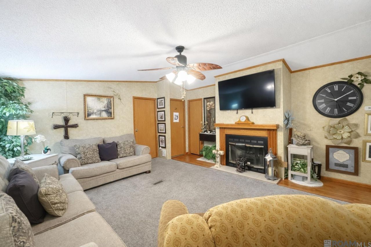 Enjoy peaceful country living on a spacious lot with beautiful mature trees and wide-open farmland views! Flood zone X! Welcome to this well-maintained 3 bedroom, 2 bathroom double-wide home sits on a large country lot surrounded by peaceful farmland views and beautiful mature trees, including a stunning large shade tree in the front yard that provides wonderful curb appeal and shade. The property offers plenty of outdoor space, while still providing a comfortable and functional layout inside. The home features a spacious living room with an electric fireplace and mantle, creating a warm and inviting space for entertaining. The open kitchen and dining area offers an open floor plan with abundant cabinetry for storage, stainless steel appliances, and a center island that provides additional prep space and seating. The primary suite includes a walk-in closet and a private en-suite bathroom with double vanities, a large soaking tub, and separate shower. Two additional bedrooms share a full guest bathroom, making the layout ideal for family or guests. Outside, enjoy the extended covered patio that overlooks the large yard, perfect for relaxing and enjoying the peaceful setting. The property also features an attached covered carport for protected parking, a limestone driveway with additional parking space, and a storage shed in the backyard for tools and equipment. A durable metal roof less than five years old adds long-term value and peace of mind. With its large lot, mature shade trees, covered outdoor space, storage building, and quiet rural setting, this property offers the perfect combination of comfort, space, and country charm.